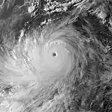 On August 23, the JMA upgraded 14W to a tropical storm, naming it Nanmadol.[9] Overnight, the system continued to intensify and early on August 24, the JMA upgraded Nanmadol to a severe tropical storm.[10] Later that day, convective banding improved and Nanmadol developed an eye-like feature.[11] As a result, Nanmadol continued to intensify rapidly and became a typhoon, by midnight, that day.[12] The JTWC originally anticipated a fujiwhara effect of Nanmadol on Talas, a weaker tropical cyclone to the east of Nanmadol.[13] However, the two cyclones moved far away from each other with at least a 1,000 nautical miles (1,900 km; 1,200 mi) of distance between them. This prompted the JTWC to change its forecast on the system, from turning east and interacting with Talas, to move west and hit the Philippines.[14] On August 26, Nanmadol reached peak strength with winds of 100 knots (190 km/h; 120 mph) (10-minute sustained) and 140 knots (260 km/h; 160 mph) (1-minute sustained) reaching category 5 status on the SSHS. The typhoon developed a large eye with a diameter of 18 nautical miles (33 km; 21 mi) with highly symmetric deep convective bands wrapped into it.[15]