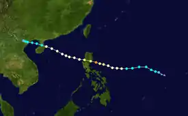 On September 29, by the time Nesat managed to re-develop a 10 nautical miles (19 km; 12 mi) ragged eye, it made landfall over Wenchang in Hainan, China and started weakening again. Because of the poor shape and disorganization at the LLCC, the typhoon could only maintain a maximum 1-min sustained windspeed of 65 knots (120 km/h; 75 mph).[20] Even after the landfall, Nesat maintained vigorous convection all around the LLCC and did not weaken too much when compared to the reactions after the Philippine landfall. There was a sea-surface temperature of approximately 28 °C (82 °F) and a slight vertical wind shear of 10 knots (19 km/h; 12 mph) near the system's center at that time. The JTWC anticipated the storm to gradually drift over the Gulf of Tonkin and make landfall over Vietnam with a 1-min sustained wind speed of at least 50 knots (93 km/h; 58 mph).[21] Early on September 30, Nesat made its final landfall over northern Vietnam with a 1-mim sustained windspeed of 55 knots (102 km/h; 63 mph) and a well-defined, tightly wrapped LLCC, and soon it started weakening. Due to land interaction, the convection around the system started decaying rapidly.[22] Due to the rapid weakening, the JTWC ceased advisories on the storm, soon afterwards.[23] Later that evening, the JMA downgraded Nesat to a tropical low over land and issued their final warning on the system.[24]