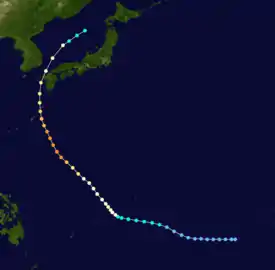 Initially, Tropical Storm Robyn meandered erratically within a mesoscale convective system.[2] At noon on August 3, the JMA upgraded Robyn into a severe tropical storm.[4] Banding features increased in coverage that afternoon as the storm itself slowed down. Early on August 4, the JTWC estimated that Robyn attained typhoon intensity, although operationally, this was believed to have occurred 12 hours earlier, when Dvorak intensity estimates supported an intensity of 120 km/h (75 mph). Robyn then began to cease all westward movement and instead took a dive south, only to turn north and later northwest.[2] According to the JMA, Robyn leveled off in intensity for 30 hours, and did not become a typhoon until noon on August 5.[4] Early on August 6, data from the JTWC suggested that Robyn entered a period of rapid deepening over 36 hours, ending winds of 235 km/h (145 mph). The JMA disagrees, noting that only slight intensification occurred during this period. On August 7, the JMA estimated that Robyn attained its peak intensity of 160 km/h (100 mph), with a barometric pressure of 945 mbar (27.9 inHg). Starting late on August 7, the JTWC estimated that Robyn began a weakening trend, although according to the JMA, Robyn maintained its intensity through August 8, with its pressure further dropping to 940 mbar (28 inHg)[7] After passing through the Ryukyu Island, Robyn skirted past western Kyushu on August 9 while steadily weakening.[3] Midday on August 10, both the JTWC and JMA agreed that Robyn lost typhoon intensity over the Sea of Japan.[7] The next day, both the JTWC and JMA classified the system as an extratropical cyclone.[2][4]