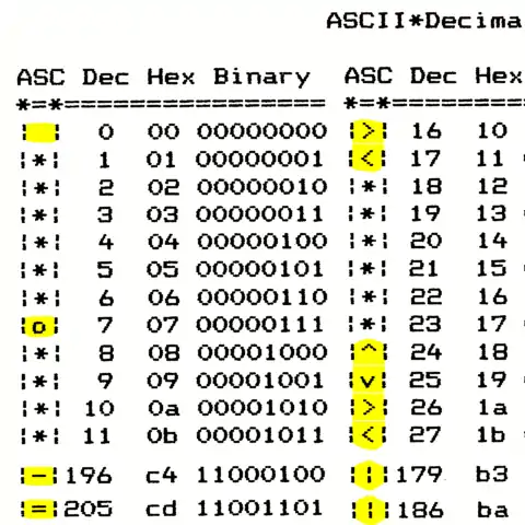 | An ASCII approximation (above) may be ugly, but giving some representation of several symbols. Replacements of non-ASCII characters (others than default "*") are highlighted in yellow. | ||||||||