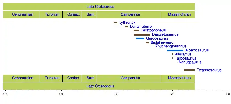 | Montage of six tyrannosaurids, clockwise from top left: Tyrannosaurus, Daspletosaurus, Tarbosaurus, Gorgosaurus, Zhuchengtyrannus and Alioramus | |
