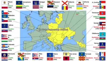 The United States European Command State Partnership Program (EUCOM SPP), according to its own mission, is a National Guard program that "links U.S. states with designated partner countries to ... support the command’s security cooperation objectives."[3] Currently, 22 Partnerships exist "with former Soviet, Yugoslav and Warsaw Pact countries in the EUCOM Area of Responsibility." Becoming independent on the dissolution of the Soviet Union on December 26, 1991, these countries shortly requested the advice and assistance of the United States in creating new self-defense forces.