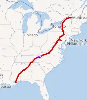 U.S. Route 11 or U.S. Highway 11 (US 11) is a major north–south (while physically generally northeast-southwest) United States highway extending 1,645 miles[1] (2,647 km) across the eastern United States. The southern terminus of the route is at U.S. Route 90 in the Bayou Sauvage National Wildlife Refuge in eastern New Orleans, Louisiana. The northern terminus is at the Rouses Point–Lacolle 223 Border Crossing in Rouses Point, New York. The route continues across the border into Canada as Quebec Route 223. US 11, created in 1926, maintains most of its original route. The route north of Knoxville, TN follows a route similar to I-81.