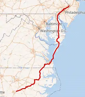 U.S. Route 13 (US 13) is a north–south U.S. highway established in 1926 that runs for 517 miles (832 km) from Interstate 95 (I-95) just north of Fayetteville, North Carolina to US 1 in the northeastern suburbs of Philadelphia, Pennsylvania, in Morrisville. In all, it traverses five states in the Atlantic coastal plain region. It follows the Atlantic coast more closely than does the main north–south U.S. highway of the region, US 1. Its routing is largely rural, the notable exceptions being the Hampton Roads area in Virginia and the northern end of the highway in Delaware and Pennsylvania. It is also notable for being the main thoroughfare for the Delmarva Peninsula and carrying the Chesapeake Bay Bridge–Tunnel to it in Virginia.