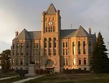 After passing Hebron to the south, the highway continues on its easterly heading. For the next 20 miles (32 km), the highway continues to pass through the vast agricultural fields of southeastern Nebraska. Included in this stretch is the small community of Gilead, which the highway passes to its south. Just east of Gilead, the highway comes to an intersection with N-53 which heads to the north towards Alexandria. Continuing east the highway crosses the Little Blue River before entering the city of Fairbury. Fairbury was the home of the Western Division headquarters of the Rock Island Railroad until 1965. The Rock Island Depot was constructed in 1913 at a cost of $40,000 (equivalent to $782,444 in 2020[13]) to accommodate increased passenger and freight loads. The depot is an example of Renaissance Revival architecture with brick pilasters topped with stone trim, a hipped roof of red clay tile, overhanging eaves and decorative brackets.[14] On the east side of the city, US 136 intersects N-15 before exiting Fairbury to the northeast. After leaving Fairbury, the highway begins to meander in a general northeasterly direction, a stark contrast to its almost due east path prior. It passes through the south end of Jansen then the north sides of the small communities of Harbine and Ellis before swinging to the north before it enters the city of Beatrice. The highway then turns back to the east and comes to an intersection with N-4. The two highways then head east into the heart of Beatrice. When the Homestead Act went into effect on January 1, 1963, Daniel Freeman persuaded a clerk to open the local Land Office so he could make a claim for a homestead 4 miles (6.4 km) west of Beatrice. In 1936, Congress dedicated the Homestead National Monument of America on the site of Freeman's claim.[15][16]