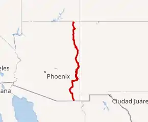 U.S. Route 191 (US 191) is a north–south United States Highway within Arizona. The highway runs for 517 miles (832 km), the longest of any numbered highway in Arizona, from State Route 80 near Douglas to the Utah state line near Mexican Water. As it crosses the state, US 191 overlaps at various points: I-10, US 70, US 180, US 60, SR 61, I-40, SR 264, and US 160. Previously the route was designated as US 666 and SR 63.