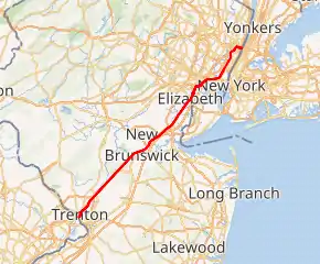 U.S. Route 1 crosses the Delaware River into New Jersey on the Trenton–Morrisville Toll Bridge, which is maintained by the Delaware River Joint Toll Bridge Commission. Once in Trenton, US 1 becomes the Trenton Freeway and is maintained by the New Jersey Department of Transportation. US 1 meets Route 29 at a partial diamond interchange just north of the river.[1][2] As the road heads through the downtown area with Amtrak’s Northeast Corridor running next to the route on the east side, it has a southbound exit and entrance with Warren Street that provides access to the New Jersey State House. It then comes to an interchange with the northern terminus of Route 129 as well as the western terminus of Route 33 near the Trenton Transit Center serving Amtrak, NJ Transit's Northeast Corridor Line and River Line, and SEPTA's Trenton Line.[1][2]