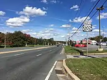 In 1953, the portion of US 202 along the Concord Pike between the Wilmington border and Murphy Road was widened into a four-lane divided highway.[17] In September 1953, construction began to widen the portion of US 202 between Murphy Road and Talleyville into a four-lane divided highway. This widening was completed in October 1954.[18] In 1955, recommendations were made to widen US 202 between Talleyville and the Pennsylvania state line.[19] The divided highway was extended north from Talleyville to the Pennsylvania state line in 1957.[20][21]