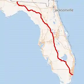 U.S. Route 27 (US 27) in Florida is a north–south United States Highway. It runs 481 miles (774 km) from the South Florida Metropolitan Area northwest to the Tallahassee Metropolitan Statistical Area. Throughout the state, US 27 has been designated the Claude Pepper Memorial Highway by the Florida Legislature. It was named after long-time Florida statesman Claude Pepper, who served in both the U.S. Senate and House of Representatives. The stretch running from Miami to South Bay was originally designated the Thomas E. Will Memorial Highway by the Florida Legislature in 1937 when that portion was known as Florida State Road 26.[2] Will, the founder of Okeelanta, Florida, had worked for almost twenty years to get the state to build a road from Miami to the area south of Lake Okeechobee.[2] For most of its length in the state, US 27 is a divided highway.