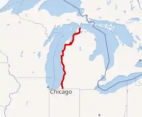 US Highway 31 (US 31) is a part of the United States Numbered Highway System that runs from Alabama to the Lower Peninsula of the US state of Michigan. In Michigan, it is a state trunkline highway that runs from the Indiana–Michigan state line at Bertrand Township north to its terminus at Interstate 75 (I-75) south of Mackinaw City. Along its 356.5-mile-long (573.7 km) route, US 31 follows the Michigan section of the St. Joseph Valley Parkway as well as other freeways and divided highways northward to Ludington. North of there, the trunkline is a rural undivided highway through the Northern Michigan tourist destinations of Traverse City and Petoskey before terminating south of Mackinaw City. Along its route, US 31 has been dedicated in memory of a few different organizations, and sections of it carry the Lake Michigan Circle Tour (LMCT) moniker. Four bridges used by the highway have been recognized for their historic character as well.