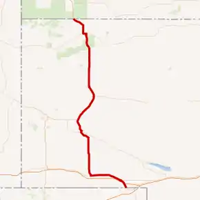 U.S. Route 385 (US 385) is a part of the United States Numbered Highway System that travels from Big Bend National Park in Texas to US 85 in Deadwood, South Dakota. Within the state of Nebraska, the highway is known as the Gold Rush Byway, one of nine scenic byways across the state.[2] The highway follows along the old Sidney-Black Hills trail which played a crucial role during the Black Hills Gold Rush in the late 1870s. It served as the primary route to transport gold and mining gear between Sidney, Nebraska and the Black Hills to the north. Today, the highway enters Nebraska in the southeastern portion of the Nebraska Panhandle on the state line with Colorado northeast of Julesburg and continues in a northerly direction to the South Dakota state line north of Chadron.