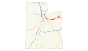 U.S. Route 40 begins at I-80 at Silver Creek Junction in Silver Summit, traveling south-southeast as a full freeway in a broad valley northeast of Park City. At the south end of the valley, Jordanelle Reservoir comes into view and US-40 continues south high on the slope above its western shore while Utah State Route 248 climbs away to the east on the slope overlooking the northern shore. The freeway passes through several large cuttings in the side of the mountains that were dug when US-40 was relocated to make way for the reservoir; Utah State Route 319 provides access down the slope to a state park on the shore of the reservoir. South of the reservoir, the dam is visible on the left and the road loses elevation quickly before abruptly connecting to an exurban non-freeway segment with frequent curb cuts and building frontage. In central Heber, U.S. Highway 189 continues south, but US-40 turns east to leave the city. US-40 continues south and east through mountains and the Uintah Basin to the Colorado border near Dinosaur National Monument.[2]