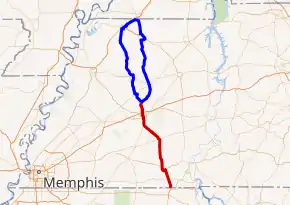 | Jackson–Three Way line | 60.7– 60.8 | 97.7– 97.8 | Senator Bobby Carter Memorial Bridge over the Middle Fork of the Forked Deer River | ||||
