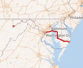 US 50 has two segments located in the state of Maryland totaling 149.67 mi (240.87 km).[1][2][3] The 9.17-mile (14.76 km) western segment is a two-lane undivided road through rural mountain areas in Garrett County, heading into West Virginia at both ends.[1][2] The 140.50-mile (226.11 km) eastern segment runs between the Washington, D.C. border in Prince George's County and the eastern terminus of the route at MD 528 and MD 378 in Ocean City as a multilane divided highway with some freeway segments. Between Washington, D.C. and Annapolis, US 50 follows a freeway called the John Hanson Highway, which is designated as unsigned I-595 between the interchanges with I-95/I-495 (the Capital Beltway) in New Carrollton and MD 70 in Annapolis. In Bowie, US 301 becomes concurrent with US 50 and unsigned I-595. East of Annapolis, US 50/US 301 continue east along a freeway called the Blue Star Memorial Highway. The two routes pass over the Chesapeake Bay on the Chesapeake Bay Bridge, linking the Western Shore and the Eastern Shore regions. After the bridge, US 50/US 301 head east across Kent Island before the freeway ends and the two routes split in Queenstown. From here, US 50 becomes an at-grade divided highway called Ocean Gateway and runs through rural areas of the Eastern Shore, heading south through Easton to Cambridge. The route turns southeast in Cambridge and continues through more rural land to Salisbury, which it bypasses to the north on a freeway called the Salisbury Bypass, a bypass road partly shared with US 13. Past Salisbury, US 50 becomes an at-grade divided highway again and continues east along the Ocean Gateway to Ocean City.[1][3]