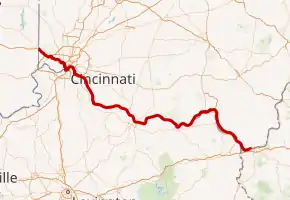 U.S. Route 52 (US 52) runs east–west across the southern part of the state of Ohio along the Ohio River, passing through or very near the cities and towns of Cincinnati, Portsmouth, and Ironton. For its first 19 miles (31 km) or so, the highway runs concurrently with Interstate 74 (I-74) and I-75 before it winds through downtown Cincinnati for several miles. The route is primarily two lanes between New Richmond and West Portsmouth, Ohio, where it becomes a four-lane partial access highway until it exits the state near Chesapeake.
