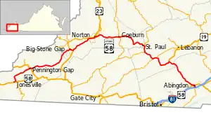 U.S. Route 58 Alternate (US 58 Alt.) is a 87.40-mile-long (140.66 km) alternate route to US 58 in western Virginia. The route is a northern bypass to US 58 which stays closer to the Tennessee border and serves Gate City and Bristol.