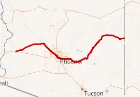 In 1927, what is now US 60 was signed as or roughly followed by SR 74 between the California border near Ehrenburg and Wickenburg, US 89 from Wickenburg to Florence Junction, US 80 from Phoenix to Florence Junction, US 180 from Florence Junction to Globe and US 70 between Springerville and the New Mexico border. The segment of highway between Springerville and Globe had not been constructed yet.[4][5][6] US 60 was extended into Arizona on June 8, 1931, from its original western terminus at US 66 in Springfield, Missouri.[7] While what is now US 60 was under construction between Globe and Springerville, US 60 was temporarily routed down SR 73 as US 60T through San Carlos and McNary. The current route through Show Low was completed sometime between 1935 and 1938.[8] US 60 through Arizona has had far fewer major changes than some other U.S. routes, but one notable example is being replaced by Interstate 10 between Los Angeles, California, and the highway's current terminus near Quartzsite. (The Arizona section of this route was decommissioned in 1982.[9])