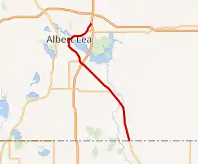 US 65 enters Minnesota just south of the community of Gordonsville. Parallel to a Union Pacific rail line through farmland, the route travels northwest and passes east of Gordonsville and west of downtown Glenville towards its first interchange with I-35.[3][4][5] At the interchange, the road enters the city of Albert Lea, expands to a four-lane divided highway and a business loop of I-35 begins, a route co-signed along US 65. The route curves to a true north-south direction north of 7th street in Albert Lea and narrows to a two-lane urban street known as Broadway Avenue. At a junction with MN 13, the route turns onto a four-lane divided highway known as Main Street and begins traveling east towards I-35. Near the end of the route, it splits from Main Street at a partial interchange with CSAH 46, which continues east and provides access to southbound I-35 via a diamond interchange. US 65 then travels northeast and merges onto northbound I-35 at a partial interchange, where it and business loop 35 end.[6]