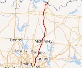 US 75 begins at I-345, an unsigned auxiliary route of I-45 and heads north, first interchanging Spur 366 northeast of Dallas. The highway then interchanges with SH 12 before forming the High Five Interchange with I-635. Then, it interchanges with the President George Bush Turnpike as it continues north through Plano. It then interchanges with the Sam Rayburn Tollway, becoming concurrent with SH 121 and then heads through McKinney and interchanging with US 380. The stretch through McKinney is largely unchanged from its original design except for its intersection at the Sam Rayburn Tollway.[20] to replace the original interchange. Plans to upgrade the facility through and north of McKinney are under way with the reconstruction of the US 380 bridge. US 75 then splits from SH 121 in Melissa and continues north. In Sherman, the route crosses over SH 56 and then US 82. North of Denison, it becomes concurrent with US 69 for the next 2 miles (3.2 km) before crossing over the Red River and into Oklahoma.