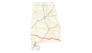 U.S. Route 84 (US 84) in Alabama travels west to east across southern Alabama for 237.400 miles (382.058 km). US 84 enters the state from Mississippi west of Silas and exits into Georgia southeast of Gordon. Along its route, US 84 passes through the limits of the towns and cities of Silas, Coffeeville, Grove Hill, Repton, Evergreen, River Falls, Andalusia, Sanford, Babbie, Opp, Elba, New Brockton, Enterprise, Level Plains, Daleville, Dothan, Cowarts, Avon, Ashford.