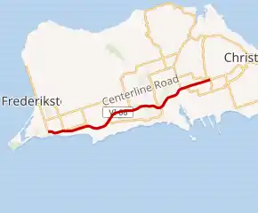 U.S. Virgin Islands Highway 66 is a major east–west arterial on St. Croix in the United States Virgin Islands and is named the Melvin H. Evans Highway in honor of the territory's first elected governor. It is one of the few divided highways in a territory with the distinction of being the only US jurisdiction to drive on the left. It is also the fastest road on the island—and in the territory—with a 55 mph speed limit for passenger vehicles (except buses) and a 40 mph (64 km/h) limit for heavy trucks and buses.[3] All junctions are at-grade, there are stoplights with connecting roads, and driveway access is limited by default in the territory[4] but the highway is not explicitly classified as an expressway. It is an important intermediate link between locations on the southern coast, including an oil refinery of the Hess Corporation and the Henry E. Rohlsen International Airport, and the island's principal towns Christiansted and Frederiksted. The highway travels through areas of mostly lighter development and has multiple spurs and other intersections connecting to parallel roads and smaller communities. St. Croix has no single encircling route so the highway is one of the most heavily used.[5]