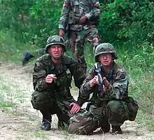 The U.S. Woodland is a camouflage pattern that was used as the default camouflage pattern issued to the United States Armed Forces from 1981, with the issue of the Battle Dress Uniform, until its replacement in the mid to late 2000s.[1] It is a four color, high contrast disruptive pattern with irregular markings in green, brown, sand and black. It is also known unofficially by its colloquial moniker of "M81",[2][3] though this term was not officially used by the U.S. military. Although completely phased out of frontline use in the U.S. Armed Forces, U.S. Woodland is still used on some limited level by some branches such as MOPP suits, equipment and vests left over while some modernized uniforms (either BDU or commercial) were worn specifically by special forces such as USMC Forces Special Operations Command and United States Navy Seabees.