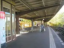 The 110 metre-long U-Bahn station with its blue, white and yellow colour scheme had skylights, which were rare in the Berlin U-Bahn network, to enable natural light to penetrate into the station. It was designed by the architect Orlando Figallo. During the construction, a generous entrance building was built at the same time with a lift and escalators to provided convenient connections to S-Bahn line S2 to Bernau.[7] There are also still plans according to which the U2 line would be extended to the old parish church in Breiten Straße in Pankow. This plan is also included in the Berlin Senate's 2030 financial scenario. This is consider a medium-term priority.[8]