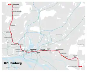 The U2 is a line of the Hamburg U-Bahn which has a length of 24.543 kilometres (15.25 mi). It serves 25 stations. The line opened in 1913. It starts in Niendorf Nord and leads via the city center at Hauptbahnhof Nord to Mümmelmannsberg.[1]