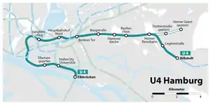 The U4 is a line of the Hamburg U-Bahn, which opened in 2012, serving 12 stations. It is the shortest line of the network, with a length of 11.9 kilometres (7.39 mi) and from Jungfernstieg to Billstedt it shares tracks with the U2.[1][2][3]