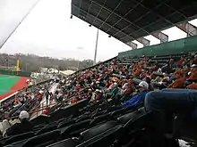 ![]() View of first base side seating at UFCU Disch-Falk Field during the 2006-07 Texas Baseball season, during renovation |