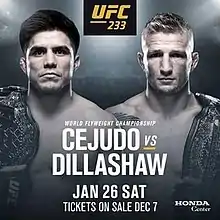 Initially, the promotion was planning a UFC Flyweight Championship bout between 2008 Olympic gold medalist in freestyle wrestling and current champion Henry Cejudo and two-time UFC Bantamweight Champion T.J. Dillashaw to headline this event.[5][6] If successful, Dillashaw would have become the fourth fighter to be champion in two divisions simultaneously (after Conor McGregor at UFC 205, Daniel Cormier at UFC 226 and Amanda Nunes at UFC 232). According to sources, the promotion was expected to dissolve the flyweight division at some point within 2019.[7] However, on December 5, the pairing was moved and took place a week earlier at UFC Fight Night 143, headlining the promotion's inaugural event on ESPN+. In turn, promotion officials tried to arrange a new pairing to anchor the event.[8]