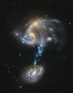 As the pair of galaxies in the north gravitationally interact with each other, tidally-stripped gas from both galaxies is draped over the southern galaxy as a series of blobs, which are fueling a burst of star formation.[5] While it has long been believed to be interacting with the northern galaxy, images from the Hubble Space Telescope clearly show that this stream of material is actually superimposed on the southern galaxy.[6] This suggests that this third galaxy may actually lie in the background. Due to this uncertainty, the third galaxy may not be involved in the interaction.