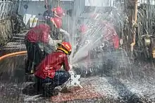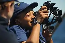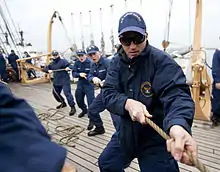 Eagle has a standing permanent crew of seven officers and 50 enlisted members; on training missions, she takes on a variety of temporary crew and sails with an average complement of 12 officers, 68 crew, and up to 150 trainees.[21] While on board, cadets and officer candidates receive a large amount of instruction from the crew. They take classes on numerous subjects that are key to life at sea, including navigation, seamanship, ship and boat maneuvering, line handling, sailing, first aid, weather patterns, damage control, engineering, career development, and more. They also stand watches in the engine room, on the bridge, on deck, in the scullery and galley, and during port calls, they assist the public by giving tours. The trainees are expected to qualify in a variety of watchstations applicable to their level of experience; for example, third class cadets complete their 'helm and lookout' qualification while upperclass cadets work to qualify in leadership positions on the bridge and in the engine room. At the same time, trainees are given a rigorous set of nautical tasks they must complete. One common training task involves the Eagle crew covering all Global Positioning System receivers on board and requiring trainees to navigate between ports using sextants, a compass, and the tools of celestial navigation.[22][23]