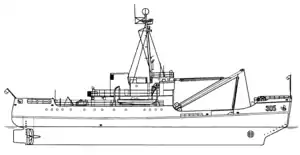 Her wartime complement was 6 officers and 74 enlisted men. By 1964 this was reduced to 5 officers, 2 warrant officers, and 42 enlisted personnel.[7][8]