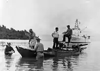 At the request of the United States Navy, in April 1965, she was alerted for service in South Vietnam and assigned to Coast Guard Squadron One in support of Operation Market Time along with 16 other Point class cutters.[13][14] While the crew completed overseas training and weapons qualifications at Coast Guard Island and Camp Parks, California, Point Young was loaded onto a merchant ship, and transported to Subic Bay, Philippines in May 1965 where she was refitted for combat service.[6] Shipyard modifications included installation of new single-sideband radio equipment, additional floodlights, small arms lockers, bunks, additional sound-powered phone circuits, and the addition of four M2 machine guns. The original bow-mounted machine gun was replaced with a combination over-under .50 caliber machine gun/81 mm trigger-fired mortar that had been developed by the Coast Guard for service in Vietnam.[5][6][14][15] For service in Vietnam, two officers were added to the crew complement to add seniority to the crew in the mission of interdicting vessels at sea.[16]