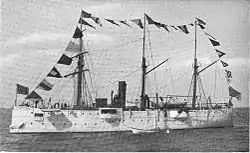 Bancroft was designated as a training ship for the United States Naval Academy midshipmen and stationed at Annapolis, Maryland. Similar in shape to a small gunboat, the ship had a steel hull and a relatively heavy armament, ranging from 4-inch rapid-fire guns to a Gatling gun and a torpedo tube, to give midshipmen experience on the Navy's latest weaponry. Between 1893 and 1896, she cruised along the United States East Coast, visiting various shipyards with groups of midshipmen embarked.[4] Naval expansion brought a corresponding increase on the Naval Academy's enrollment, and Bancroft quickly proved to be too small. After the practice cruise of 1896, she was converted into a conventional gunboat with a reduced armament and the original three-masted barkentine rig cut down to the two masts of a brigantine.[3]