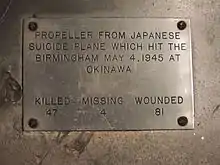 Rejoining the Pacific Fleet, the cruiser supported the battle of Iwo Jima (4–5 March 1945) and joined Task Force 54 (TF 54) for the invasion of Okinawa (25 March – 5 May). On 4 May, after fighting off three attacks, she was damaged for a third time when a Japanese kamikaze plane hit her forward. The resulting explosion killed 47, with 4 missing and 81 wounded.[5] Returning to Pearl Harbor, she underwent repairs from 28 May to 1 August.