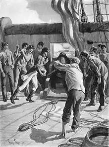 After sailing for some hours, Leopard, commanded by Captain Salusbury Humphreys, approached Chesapeake and hailed a request to deliver dispatches to England, a customary request of the time.[62] When a British lieutenant arrived by boat he handed Barron an order, given by Vice-Admiral George Berkeley of the Royal Navy, which instructed the British ships to stop and board Chesapeake to search for deserters. Barron refused to allow this search, and as the lieutenant returned to Leopard Barron ordered the crew to general quarters.[63] Shortly afterward Leopard hailed Chesapeake; Barron could not understand the message. Leopard fired a shot across the bow, followed by a broadside, at Chesapeake. For fifteen minutes, while Chesapeake attempted to arm herself, Leopard continued to fire broadside after broadside until Barron struck his colors. Chesapeake only managed to fire one retaliatory shot after hot coals from the galley were brought on deck to ignite the cannon.[64] The British boarded Chesapeake and carried off four crewmen, declining Barron's offer that Chesapeake be taken as a prize of war.[65] Chesapeake suffered three sailors killed and Barron was among the eighteen wounded.[66]