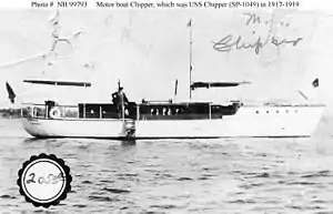 Chipper was built as a civilian motorboat of the same name in 1909 at Morris Heights in the Bronx, New York. The U.S. Navy leased her on 21 July 1917 for World War I service as a patrol vessel. She was commissioned as USS Chipper (SP-1049) on 24 July 1917.
