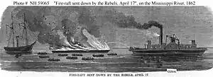 ![]() USS Clifton playing a fire hose on a Confederate fire raft on the lower Mississippi River, 17 April 1862 | |