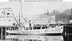 ![]() Comet as a commercial fishing trawler, apparently at the Puget Sound Navy Yard in Bremerton, Washington, probably around the time of her November 1917 acquisition by the United States Navy. | |