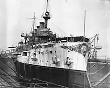 Connecticut was the leader of the ships that passed in review during the Presidential Fleet Review in New York, on 2 November; she then remained in New York, until 12 January 1912, when she returned to Guantánamo Bay. During a March overhaul at the Philadelphia Naval Yard, the battleship relinquished her role as flagship to the armored cruiser Washington. After the overhaul's completion, Connecticut's activities through the end of 1912 included practicing with torpedoes in Fort Pond Bay, conducting fleet maneuvers, and battle practice off Block Island and the Virginia Capes.[61] Stopping in New York, Connecticut conducted training exercises in Guantánamo Bay from 13 February to 20 March; during this time (on the 28th), she once again became the Atlantic Fleet flagship for a brief and final time when she served in the interim as Rear Admiral Charles J. Badger transferred his flag from Wyoming to Utah.[62][63] After taking on stores in Philadelphia, Connecticut sailed for Mexico and arrived on 22 April; she was to patrol the waters near Tampico and Vera Cruz, protecting American citizens and interests during disturbances there and in Haiti.[6][64]