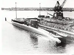 Daniel Webster was originally built with diving planes mounted on a "mini-sail" near the bow, leading to her nickname "Old Funny Fins". This configuration, unique to US submarines,[2] was an attempt to reduce the effect of porpoising. While successful, the "mini-sail" required to contain the operating mechanism reduced hydrodynamic efficiency and lowered her overall speed.[3] During a mid-1970s overhaul, these unusual planes were removed and standard fairwater planes were installed.[4] Here is a rare 1964 16mm Silent Film of USS Daniel Webster bow planes tests off Cape Canaveral also showing crew and port.
