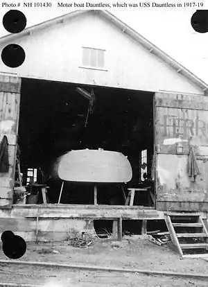 ![]() A stern view of Dauntless as a private motorboat in a boat house - possibly that of her builder, W. Frank Harrison of Essex, Connecticut - ca. 1917, prior to her United States Navy service. | |