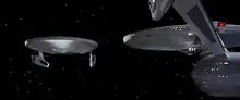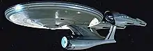 Roddenberry further specified that the Enterprise would operate mainly in space, have a crew of 100–150, and be incredibly fast.[7] Jefferies and Roddenberry did not want the Enterprise to look like any of the rocket ships already used by the aerospace industry or in popular culture;[10][11] many of Jefferies' designs were rejected for being "too conventional".[12] To meet Roddenberry's requirement that the ship look believable, Jefferies tried "to visualize what the fourth, fifth or tenth generation of present-day equipment would be like".[13] Jefferies' experience with aviation let him imbue his designs with what he called "aircraft logic".[14] He imagined the ship's engines would be too powerful to be near the crew, requiring them to be set apart from the hull.[12] While Jefferies initially rejected a disk-shaped component, worried about the similarities to flying saucers, a spherical module eventually flattened into a disk.[12][15] During one visit to Jefferies, Roddenberry and NBC staff were drawn to a sketch of the Enterprise resembling its final configuration.[16] Jefferies had created a small model of this design that, when held from a string, hung upside-down – an appearance he had to "unsell".[17] Jefferies kept the hull smooth, with a sense that the ship's components were serviced from inside.[18] When designing the Klingon starship in the third season, Jefferies rearranged and changed the shape of the Enterprise's basic modules: a main body, two engine pods, and a neck with a head on it.[19] Some of Jefferies' rejected design concepts – such as spherical hull sections and warp engines that encircle a ship – inspired future Star Trek vessel designs.[20]