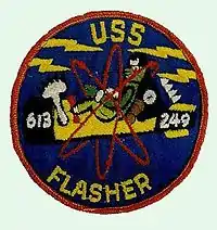 The insignia of the Flasher was adapted from the insignia of the original Flasher (SS-249), commissioned on 25 September 1943. Popular lore was that this insignia was designed by Walt Disney. However, other sources indicate that the logo was designed by a graphic artist who also worked for Disney, and that at best Walt Disney merely looked over his shoulder and provided some suggestions. During the final days of construction on the SSN-613, the crew developed several designs based on the original. The two ships' numbers were added and the electron orbits added to symbolize nuclear power. The insignia became official in 1965.