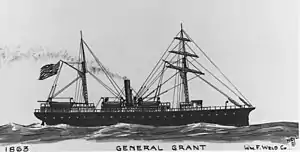 Grand Gulf arrived in New York on November 2, 1865. She was decommissioned on November 10, and was sold on November 30 to C. Comstock & Co for $86,000.[2] She was later resold to William F. Feld & Co. of Boston, Massachusetts. Renamed General Grant; the ship sailed in the Merchants' Boston and New Orleans Steamship Company[3] operating between Boston and New Orleans. She burned and sank at a wharf in New Orleans April 9, 1869.[4]