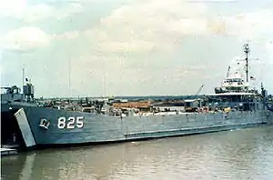 ![]() USS Hickman County (LST-825) beached at the ramp at Đồng Tâm Base Camp, South Vietnam, c. 1969 | |