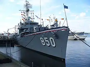USS Joseph P. Kennedy Jr. (DD-850) is a former United States Navy Gearing-class destroyer. The ship was named after Lieutenant Joseph P. Kennedy Jr., a naval aviator, son of the former Ambassador to Britain, Joseph P. Kennedy Sr., and older brother of future President John F. Kennedy. Joseph P. Kennedy Jr. served, with interruptions for modernization, until 1973. Among the highlights of her service are the blockade of Cuba during the Cuban Missile Crisis and the afloat recovery teams for Gemini 6 and Gemini 7. Joseph P. Kennedy Jr. is on display as a museum ship in Battleship Cove, Fall River, Massachusetts. She was added to the National Register of Historic Places in 1976, and designated a National Historic Landmark in 1989 as one of a small number of surviving Gearing-class destroyers.