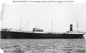 ![]() A damaged photograph of SS Los Angeles in 1916 or 1917, prior to her U.S. Navy service. | |